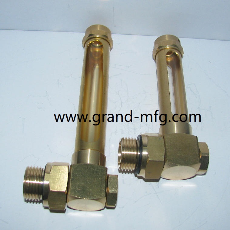 铜管油液位计 外管材:黄铜。 内管:玻璃管。 O型圈和平垫圈:NBR橡胶。 用途:泵,薄壁容器,散热器,液压油箱,接收器, 变速箱,减速器,压缩机和动力传输。