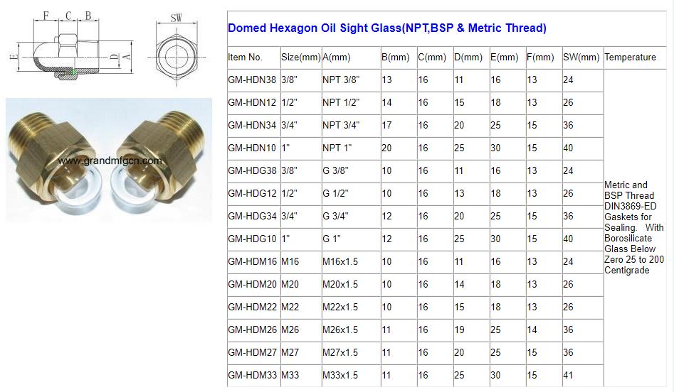 空气压机铜油液位视镜NPT1/2" 材质:黄铜 O型圈:Viton,FKM,NBR,芳纶垫片和铜密封 玻璃厚度:2mm至 8 mm 反光片:不锈钢304反光片 (您可以选择带反射器或不带反射器的任何类型,也可以添加浮球。) 玻璃类型:天然玻璃,钢化玻璃和硼硅酸盐玻璃 耐温范围:-30'C至120'C 压力范围:5-50 Bar(1MPa至5 MPa)。 螺纹类型:NPT,NPTF,UNC,UNF,公制和BSP(G螺纹) 尺寸:您可以在下面找到您想要的尺寸。也可以选择其他尺寸。欢迎OEM。 用途:泵,储油器,齿轮箱,减速器,压缩机和动力传递装置