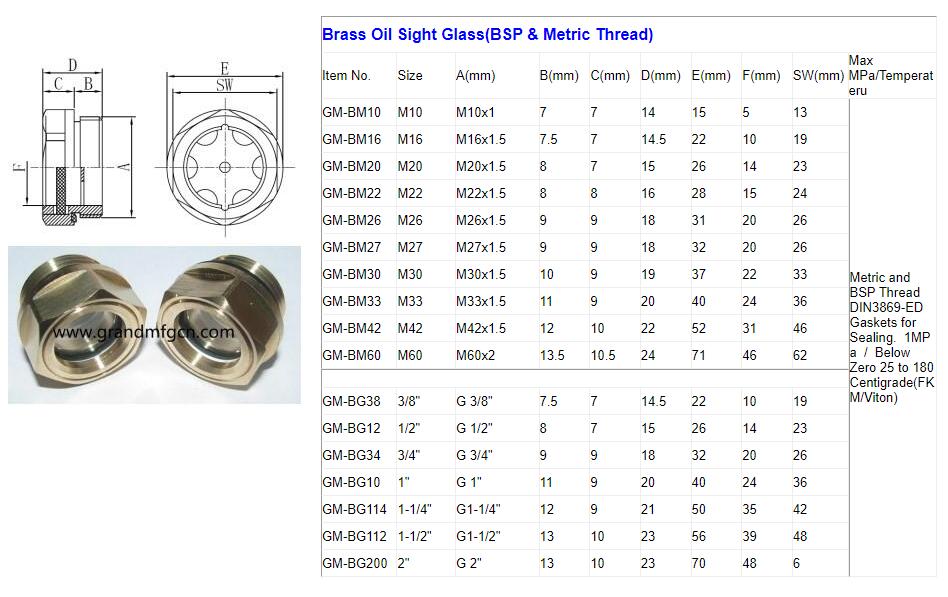 Brass oil level sight glass plugs for air compressor Brass Oil level sight glass Material Body: Brass O-Ring: Viton,FKM,FPM,NBR, Aramid gasket and Copper seal Glass Thickness: 2mm to 5 mm Reflectors: Stainless Steel 304 Reflector Glass Type: Natural Glass,Tempered Glass and Borosilicate Glass Resist Tempreature Range:-30'C to 120'C Pressure Range: 5-10 Bar(0.5MPa to 1 MPa). Thread type:NPT,NPTF,UNC,UNF,Metric and BSP(G thread)