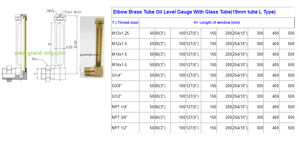 Brass Tube Oil level Indicator/Oil level Gauge with glass tube. Plastic level indicator/gauge Housing: Brass Tube . Tube: Real glass tube. O-Ring and flat gaskets: NBR Rubber. Usage: Pump, Thin-wall container, Radiator, Hydraulic reservoir, receivers, Gearboxes, Speed Reducer, Compressor and Power Transmission.